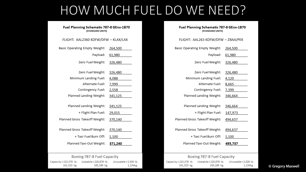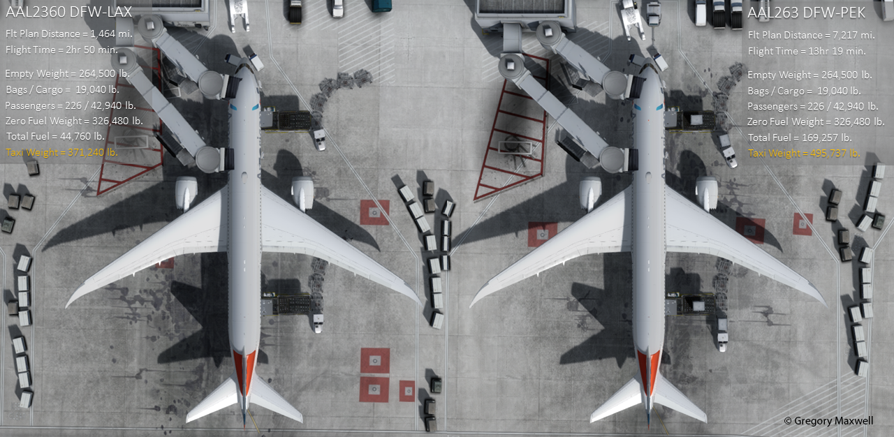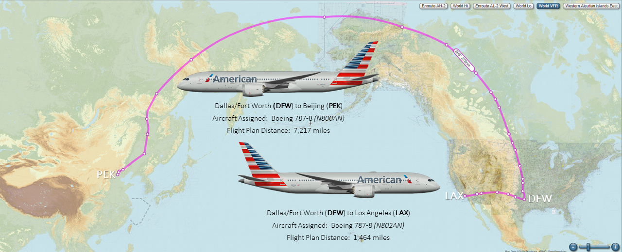 Take the example below of two identical Boeing 787-8 Dreamliners. Both are departing DFW Airport in Dallas, Texas. The first is bound for Los Angeles which is a relatively short 1,464-mile flight. The second is a trans-Pacific flight to Beijing, China which clocks in at 7,217 miles.