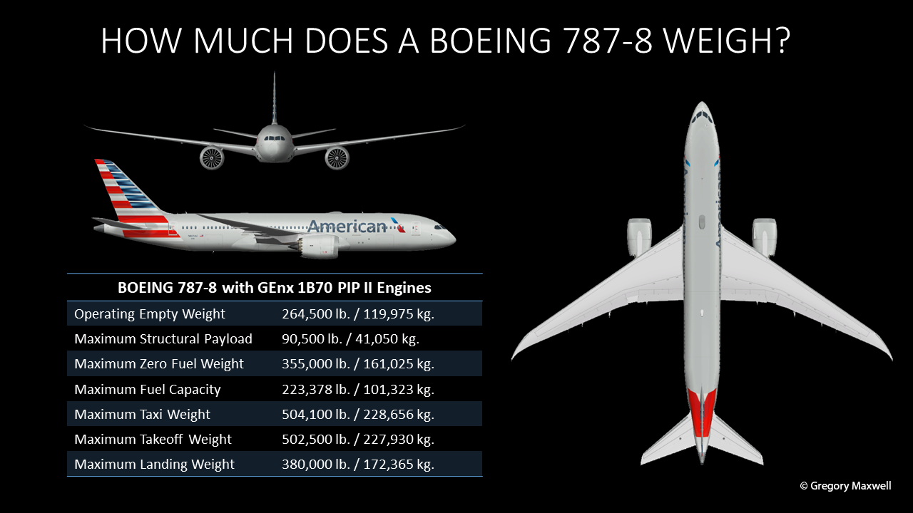 In the case of the example, Boeing 787-8 operated by American Airlines the empty weight of the airplane is 264,500 lb. and its maximum takeoff weight is 502,500 lb. This means that before a single passenger, bag, or drop of fuel is loaded more than 52% of the aircraft's maximum takeoff weight is already accounted for. This leaves 238,00 lb. available for a combination of fuel, passengers, and cargo that can be loaded. The maximum structural payload of 90,500 lb. refers to the maximum amount of passengers, bags, and cargo that can be safely carried by the airplane. Accounting for the maximum structural payload this leaves 147,500 available for fuel if the aircraft is loaded to its maximum structural payload of 90,500 lb. The airplane's empty weight plus its maximum structural payload is referred to as the maximum zero fuel weight. Boeing's 787-8 in American's configuration has a maximum fuel capacity of 223,378 lb. but with a full 90,500 payload, it's only possible to load 147,500 lb. of fuel onboard and still be below the aircraft's MTOW.