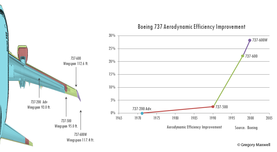 The graphic below illustrates the efficiency gains of the Boeing 737, the most produced commercial jet airplane in aviation history, through three and a half generations from the 737-200 Advanced in 1971, through to the 737-500 in 1990, and finally the 737-600 in 1998. The 737-500 was designed as a direct replacement for the 737-200, while the 737-600 was designed as a direct replacement for the 737-500. As is clearly shown in the graphic the length of the three aircraft from nose to tail remains virtually unchanged, but with each successive generation, the aircraft's wingspan grew incrementally.
