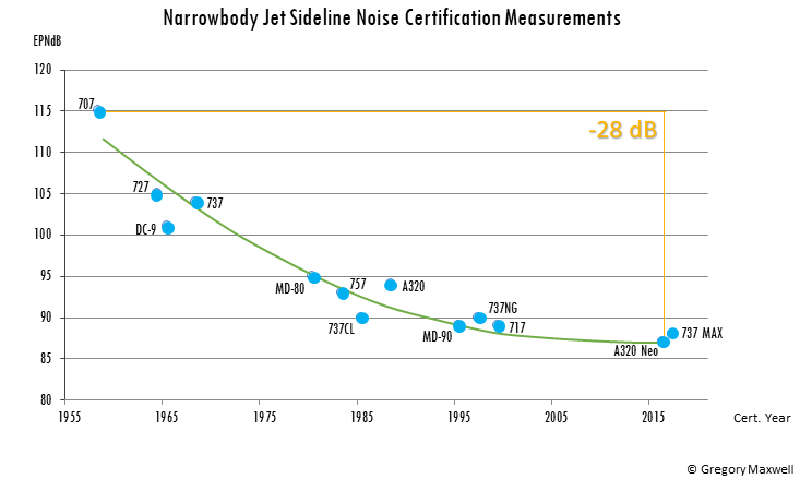 The industry has made substantial progress since the first generation of jet airlines were introduced in the 1950s. Comparing the noise certification values of narrowbody transport aircraft over the last six decades as shown in the chart below reveals that today's generation of jets like the 737 MAX and A320neo are almost 30 decibels (dB) quieter than their first-generation cousins the Boeing 707 and Douglas DC-8.