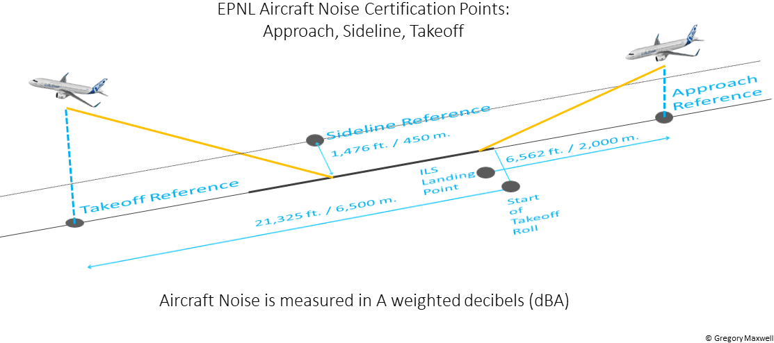 The approach phase of flight is when the aircraft is lowest to the ground as it descends on the final approach to the runway and takes into account the added airframe noise from the extended flaps, landing gear, and high engine power settings. The sideline measurement records the noise of the aircraft on its takeoff roll and very initial climb away from the runway. The Takeoff measurement is captured under the departure path of the plane when it is climbing away from the airport with the landing gear retracted, and while the flaps are in the process of being raised. The airplane is the greatest distance away from the ground at this measurement point relative to the Approach and Sideline measurements which help explain why the maximum noise level allowed is lowest at this point.