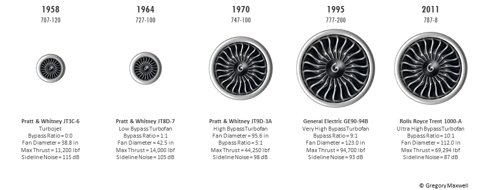 From its commercial debut in 1949 on the de Havilland Comet to the current generation the jet engine has seen numerous evolutions that allowed for dramatic leaps forward in fuel efficiency, huge increases in thrust while at the same time greatly reducing the noise of the aircraft they powered as illustrated in the chart below.