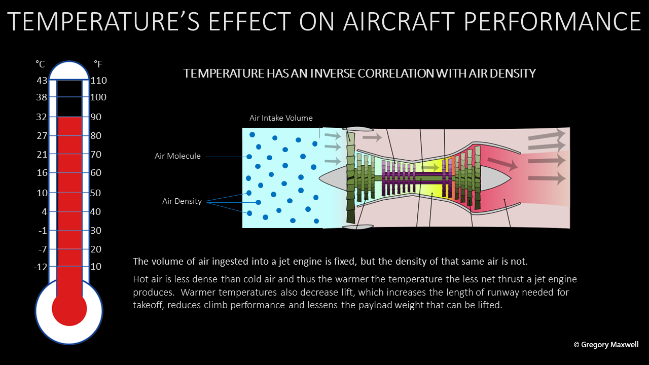 The level of noise generated varies according to aircraft size and type and can differ even for identical aircraft depending on factors such as weather conditions. Aircraft do not produce as much lift in hot weather when the air is less dense due to two factors. First jet engines produce less thrust because the air is less dense as the temperature increases. Secondly, the less dense air also affects the wing's ability to generate lift, which makes the wing less efficient and requires higher airspeeds to produce an equivalent amount of lift. Both of these factors cause planes to fly over the community at a lower altitude during climb out and require them to use more runway to become airborne.