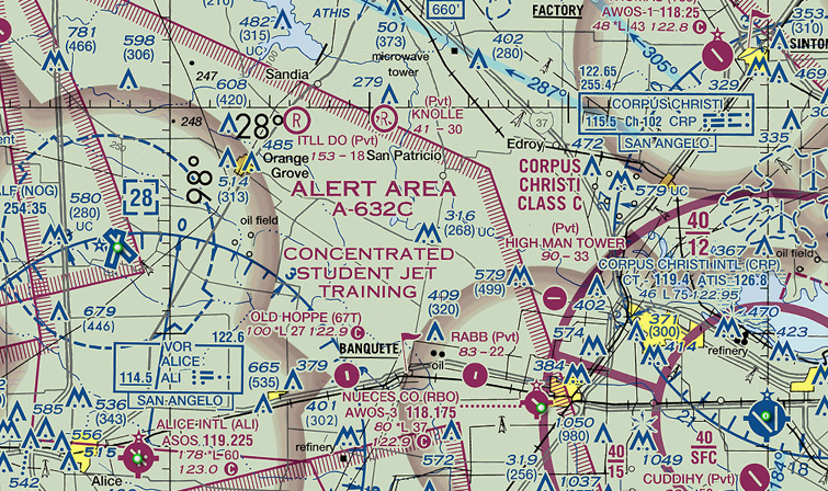 Alert Areas are areas that may contain a high volume of pilot training or another type of unusual aerial activity. Pilots should exercise caution in alert areas. All flight activity within the alert area is conducted in accordance with regulations, without a waiver, and pilots of both participating and transiting aircraft have shared responsibility for separation and collision avoidance. Alert Areas are indicated on Section Charts with an "A" followed by a number as shown in the chart below. Alert Area A-632C is an area used by the Navy for primary jet fighter training just west of Corpus Christi, TX.