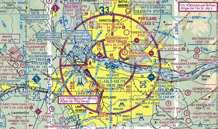 Class C airspace varies from airport to airport based on local factors, but generally includes a 5 nautical mile cylinder that extends from the surface up to 4,000 feet AGL, and a 10 nautical mile radius cylinder that extends no lower than 1,200 feet up to 4,000 feet AGL. Clearance from ATC is not explicitly required to enter Class C airspace but controllers may instruct aircraft to remain outside the airspace upon initial contact. Class C airspace is indicated on aeronautical charts by a thick magenta line as shown in the image below.