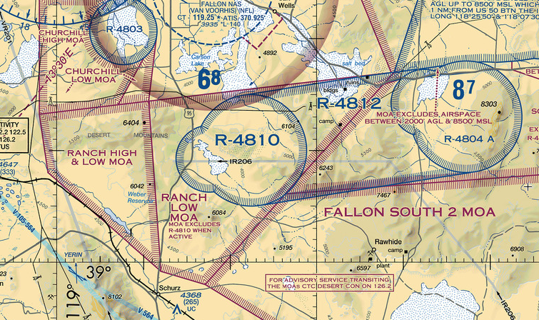 Military Operation Areas are airspace with defined vertical and lateral limits established for the purpose of military training exercises. Its purpose is to separate this special military traffic from other IFR traffic. When a MOA is in use, nonparticipating IFR traffic can still be cleared by the FAA through the airspace provided that IFR separation can be safely maintained by ATC. If not then ATC will reroute or restrict nonparticipating aircraft from entering the area. MOAs are depicted on sectional charts by name but are not numbered. The Fallon South 2 MOA shown in the image below, is located southeast of Fallon Naval Air Station in Nevada. Fallon NAS is home to the Navy's Fighter Weapons School better known as "Top Gun."