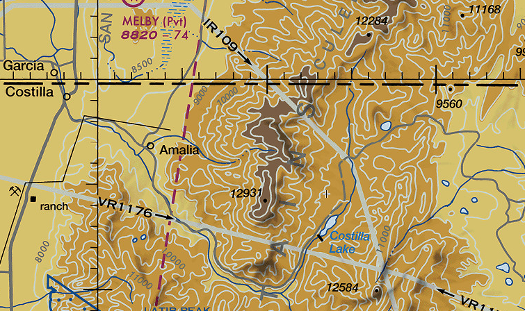 MTRs are routes utilized by military aircraft to maintain proficiency in tactical flying maneuvers. These routes are usually below 10,000 feet MSL and are designated for operational speeds over 250 knots, which is the maximum legal airspeed for flight operations from the surface up to 10,000 feet. With rare exceptions, flight speeds on MTRs are usually limited to 420 knots. While operating on the MTR military aircraft squawk a Mode C Transponder code of '4000', which informs controllers that they are 'speeding' on a route. Only military aircraft are allowed to squawk 4000 and exceed 250 knots below 10,000 feet MSL. On aeronautical charts, these routes are identified as IFR (IR), and VFR (VR), followed by a number. MTRs with all segments below 1,500 above ground level (AGL) are identified by four numbers, while routes that include at least one segment above 1,500 AGL are identified by three number characters. Military Training Route VR1176 is a low altitude high-speed training route through the Sangre de Cristo Mountain Range north of Taos, New Mexico.