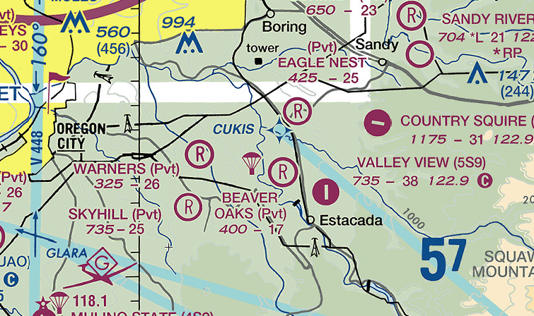 Parachute Jump Aircraft Operations are areas that are used frequently for skydiving by civilian or military operators. Aircraft operators should use caution in these areas and avoid them if possible due to the danger of collision with the aircraft or skydivers. These areas are indicated on sectional charts with a parachute icon as shown in the image below which displays a popular area for skydiving just southeast of Portland, Oregon.