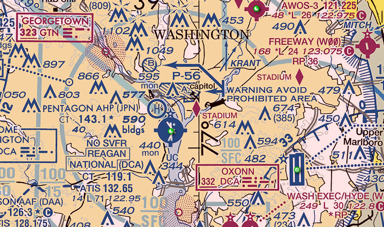Prohibited Areas contain airspace of defined dimensions within which the flight of all aircraft is prohibited. These areas are usually established for national security reasons. Prohibited areas are designated on aeronautical charts as "P" followed by a number such as P-56 which includes the National Mall, U.S. Capitol Building, and the White House in Washington D.C. Washington Reagan National Airport as shown in the graphic below is located just south of this prohibited area, and as such departing and arriving aircraft are required to avoid this area which involves the use of specially developed procedures by the FAA. Violating prohibited areas either accidentally or purposefully can result in the loss of the aircraft operator's FAA license, jail time and monetary fines.