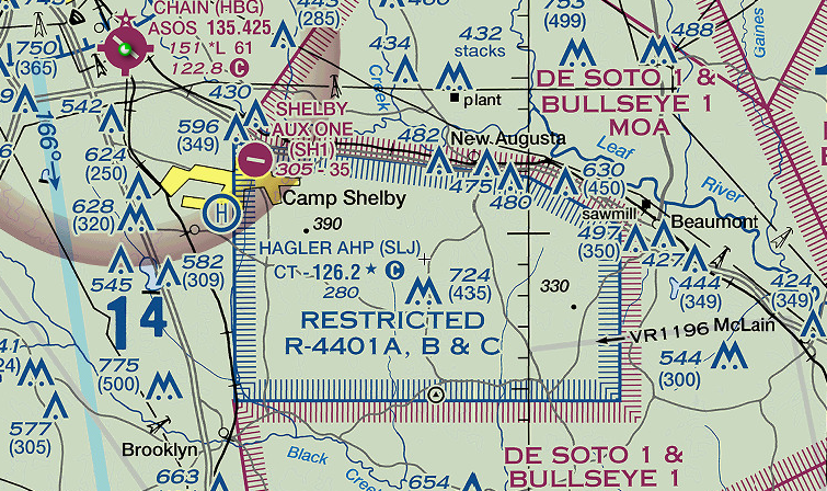 Restricted Areas are defined as areas where operations are hazardous to nonparticipating aircraft and contain airspace with which the flight of aircraft, while not wholly prohibited, is subject to restrictions. Restricted areas denote the existence of unusual, often invisible, hazards to aircraft such as artillery firing, aerial gunnery, or guided missiles. IFR flights may be granted access by the FAA to transit the airspace, however unauthorized penetration of restricted areas can be extremely hazardous to an aircraft and its occupants. Unlike Prohibited Areas in which no entry is permitted, Restricted Areas when not in use can be released to the FAA to allow civilian aircraft to use it. Under these conditions, aircraft don't have to have specific FAA clearance to utilize the airspace. Restricted Areas are shown on aeronautical charts with an "R" followed by a number as shown in the image below. Restricted Area R-4401 A, B & C is just southeast of Hattiesburg, Mississippi.
