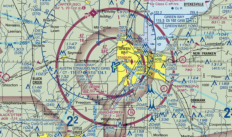 Terminal Radar Service Areas are areas where participating VFR pilots can receive additional radar services. While participation is voluntary for aircraft operating under VFR, pilots of these aircraft are encouraged to contact radar approach control and use the TRSA services as it helps ensure separation between all IFR and participating VFR aircraft. The primary airport(s) within the TRSA becomes Class D airspace. In the case of the example shown below this would be Green Bay-Austin Straubel International Airport outside Green Bay, Wisconsin.